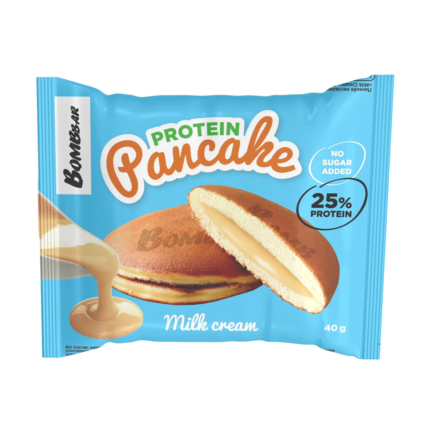 لقد أضفنا صورة إلى القائمة الدائرية تحتوي على المكونات المدرجة لـ بان كيك بروتين بومبار، كريمة حليب، قطعة واحدة.