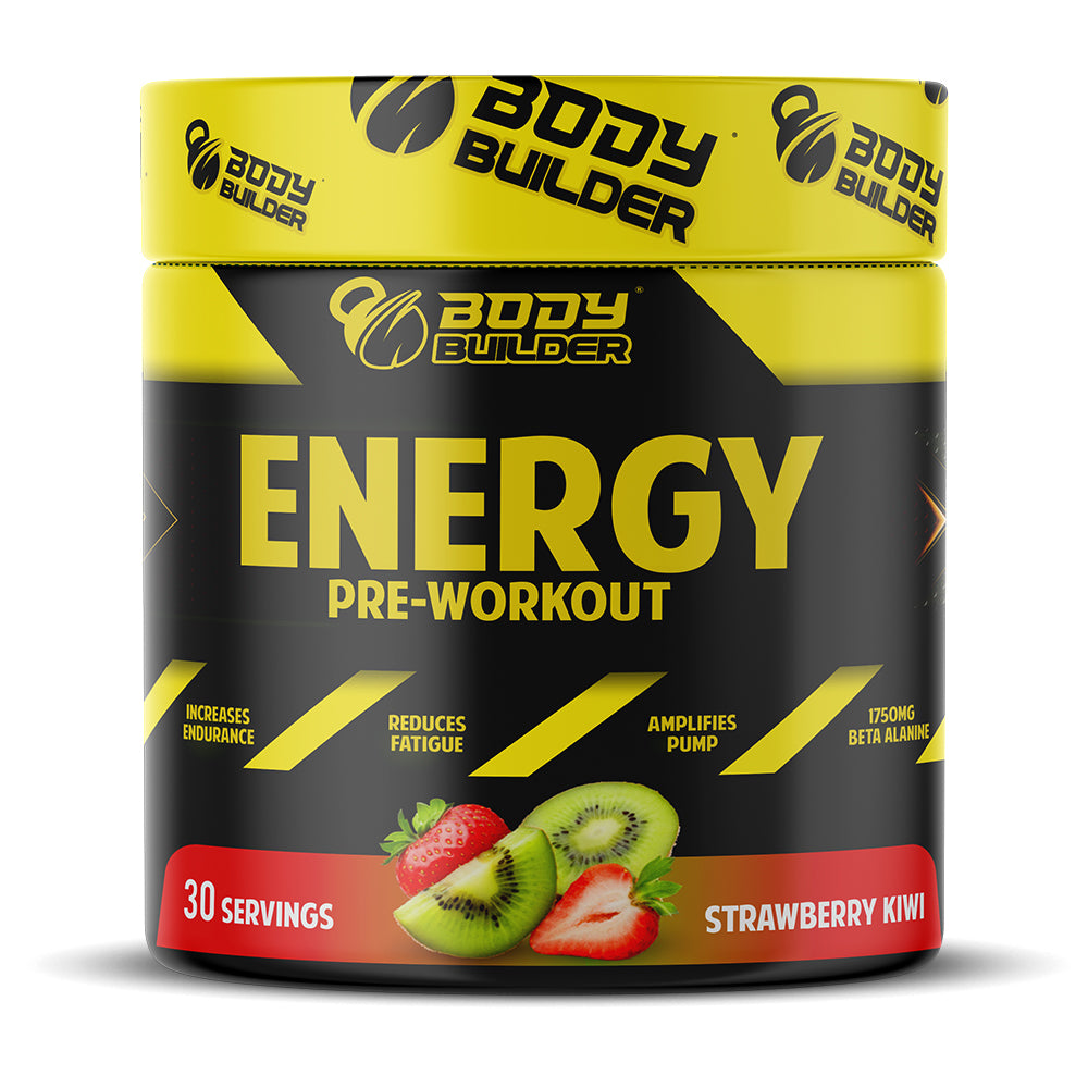 بودي بيلدر Energy PreWorkout Plus BCAA in Strawberry Kiwi flavor is designed to enhance your workout performance. This product combines preworkout energy with BranchedChain Amino Acids (BCAAs) to support lean body mass, strength, power output, and improved endurance and recovery.