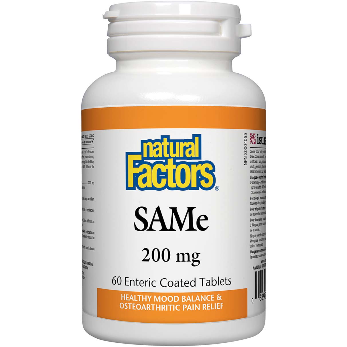 Natural Factors SAMe, 200 مجم، 60 قرصًا، هو مكمل غذائي مصمم لدعم الصحة العقلية والمفاصل. SAMe (Sadenosylmethionine) هو جزيء طبيعي يتشكل في الجسم من الميثيونين. فهو يساعد على رفع مستويات السيروتونين والدوبامين والفوسفاتيديل سيرين، والتي تعتبر مهمة لتنظيم المزاج ووظيفة الدماغ. يعمل SAMe أيضًا مع حمض الفوليك وفيتامين ب 12 لتعزيز الأداء الصحي للدماغ.
