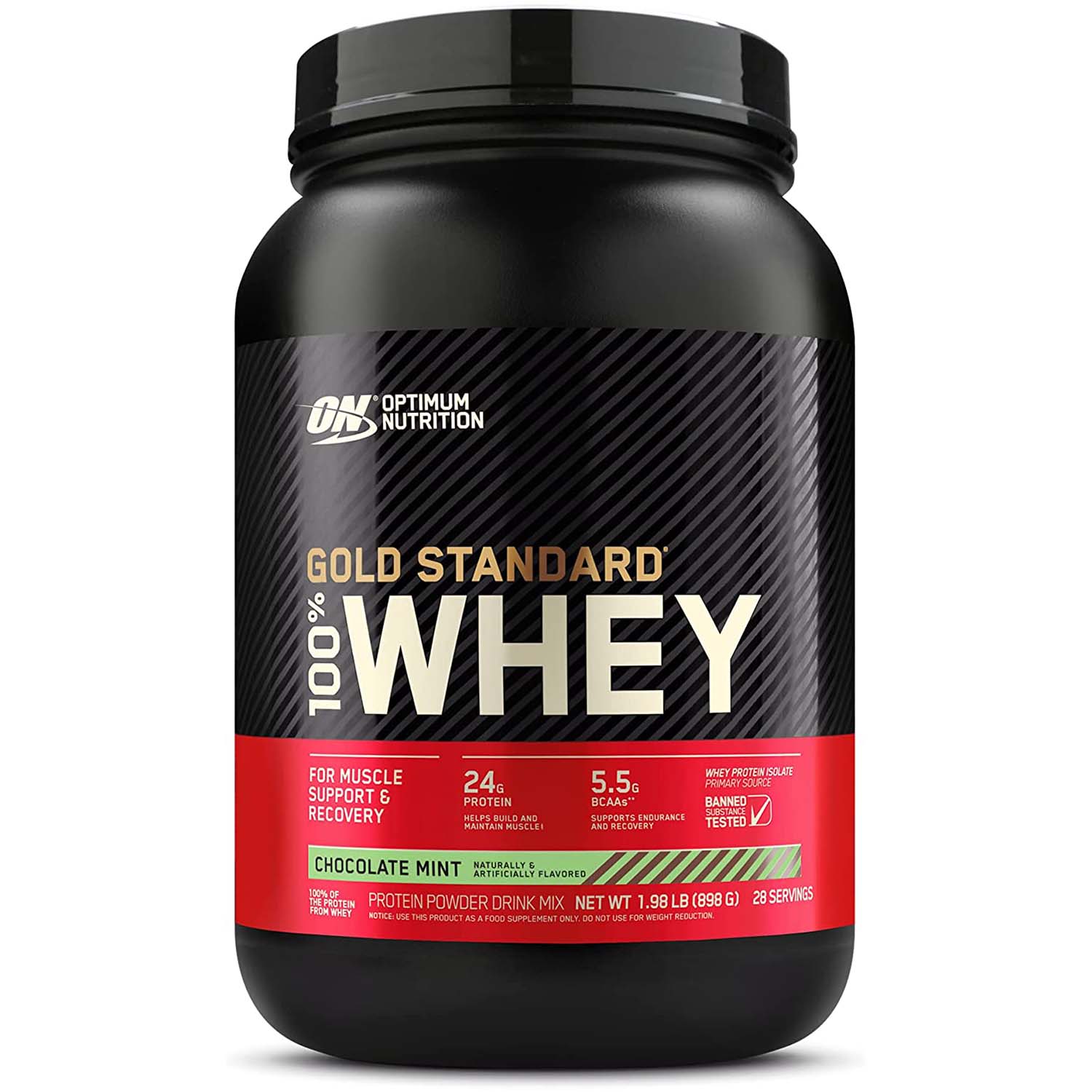بروتين مصل الحليب Optimum Nutrition Gold Standard 100% بنكهة الشوكولاتة والنعناع هو مكمل بروتين عالي الجودة مصمم لدعم بناء العضلات واستعادتها. تحتوي هذه الحاوية سعة 2 رطل على بروتين مصل اللبن المعزول كمصدر البروتين الأساسي، المعروف بنقائه وامتصاصه السريع. توفر كل حصة أحماض أمينية أساسية، بما في ذلك الأحماض الأمينية المتفرعة السلسلة (BCAAs): الليوسين والأيسولوسين والفالين، والتي تعتبر ضرورية لإصلاح العضلات ونموها.