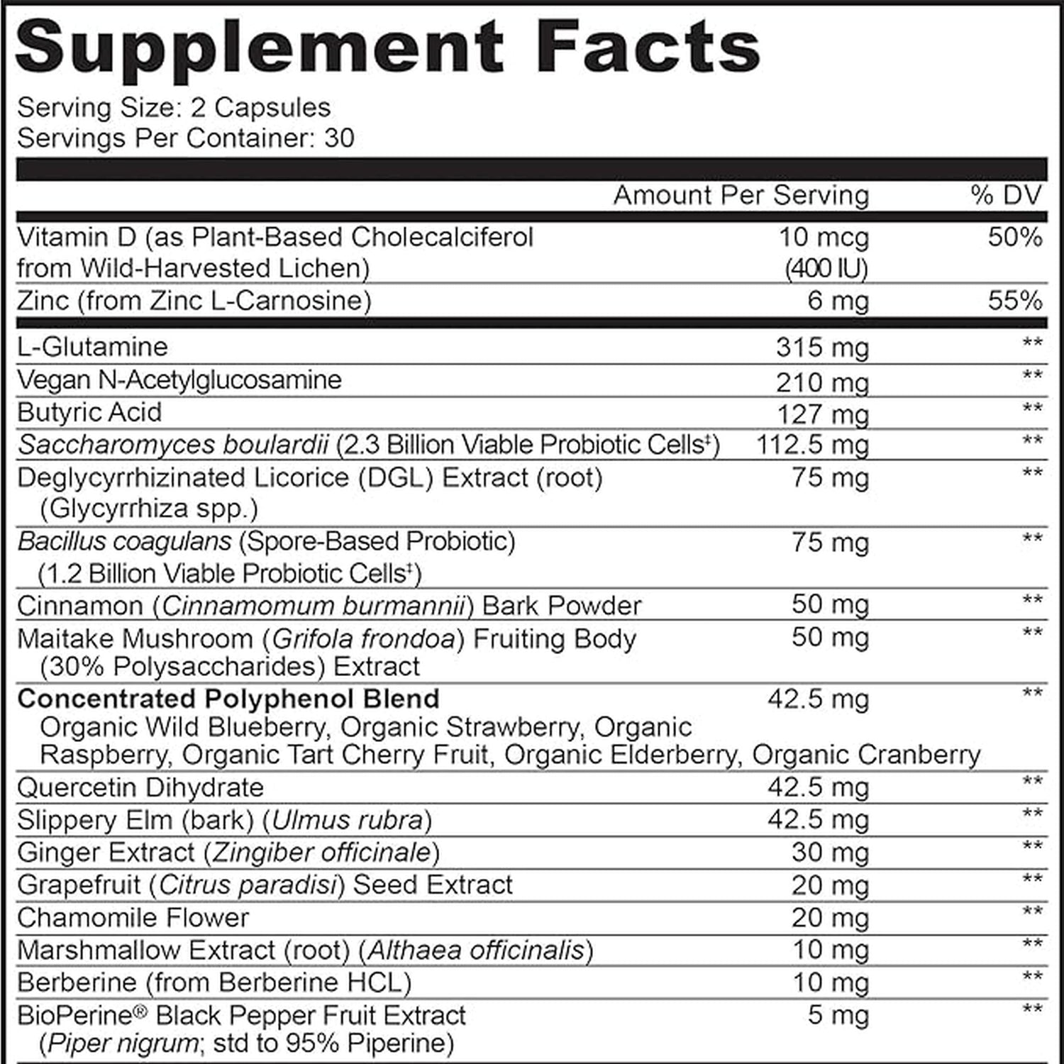تتألق التركيبة مع N-Acetylglucosamine، الذي قد يعزز سلامة الأمعاء، وحمض البيوتيريك، المعروف بفوائده لبطانة المعدة والأمعاء. يُشتق حمض البوتيريك بشكل طبيعي من مصادر مثل الزبدة والسمن، وهو ضروري للحفاظ على بيئة هضمية متوازنة.