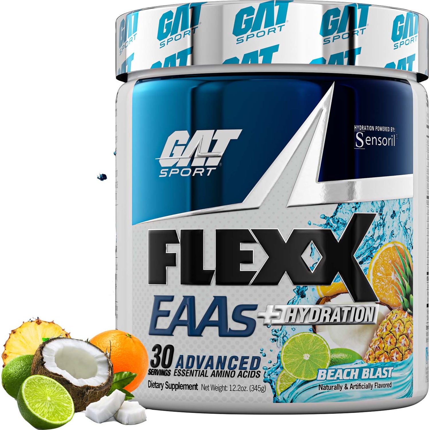 GAT Sport Flexx EAAs، Beach Blast، 30 حصة، هو مكمل شامل مصمم لدعم الحفاظ على العضلات، والطاقة، والقدرة على التحمل، والتعافي. فهو يوفر جميع الأحماض الأمينية الأساسية التسعة (EAAs) اللازمة لتخليق البروتين العضلي بالكامل. توفر كل حصة 7 جرامات من الأحماض الأمينية الأساسية، بما في ذلك 5 جرامات بنسبة 2:1:1 المفضلة سريريًا من الليوسين والأيسولوسين والفالين.