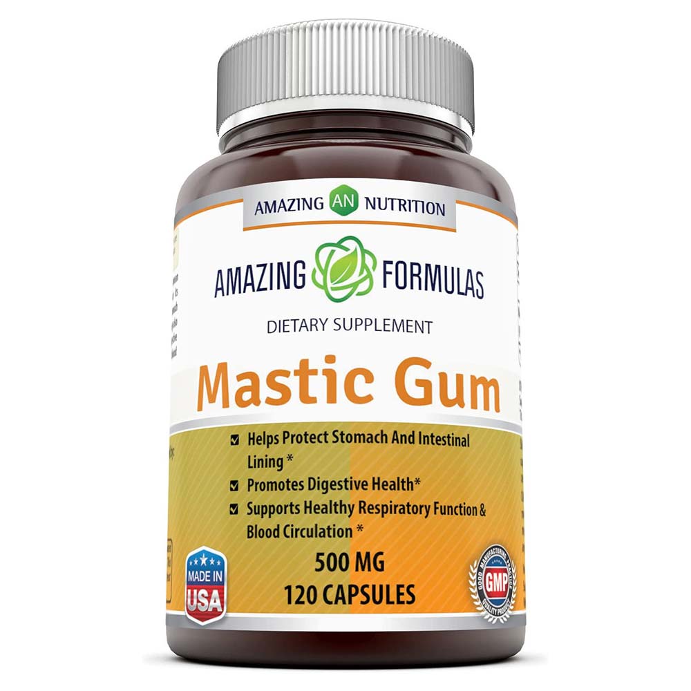 Amazing Formulas Mastic Gum is a dietary supplement containing 1000 mg of mastic gum per serving, derived from the resin of the Mediterranean Mastic Tree (Pistacia Lentiscus). Known for its antiinflammatory properties, mastic gum is beneficial for digestive health, potentially alleviating issues such as heartburn and indigestion. It may help reduce stomach acid and protect the lining of the stomach and intestines. Additionally, this supplement supports healthy respiratory function, oral health, and blood circulation.