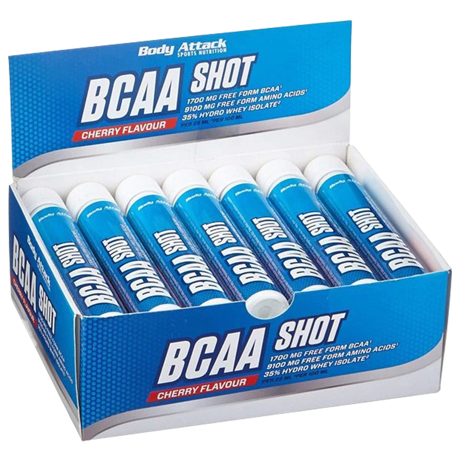 Body Attack BCAA Shot, Cherry, Box of 12 Shots, is a highquality protein supplement designed for athletes and fitness enthusiasts. Each 25 ml shot contains 1.8 g of BranchedChain Amino Acids (BCAAs), which are essential for muscle growth and recovery. The primary ingredient is whey protein, known for its high biological value, making it effective for building and maintaining muscle mass.