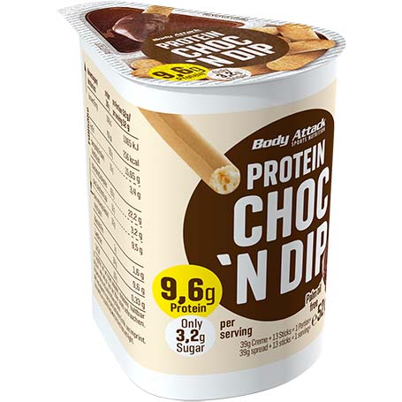 Body Attack Protein Choc N Dip is a convenient, proteinfocused snack designed for onthego consumption. It features a hazelnut cocoa cream paired with 13 crispy breadsticks for dipping. This snack is suitable for various settings, including the cinema, openair events, the office, or during sports activities. The compact snack box easily fits into handbags and sports bags, making it a practical alternative to traditional protein bars or spreads.
