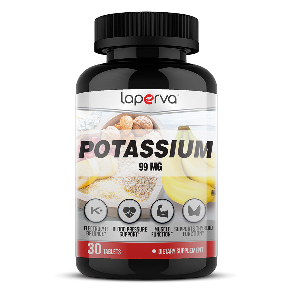 Laperva Potassium with Kelp (Iodine) is a dietary supplement designed to support various bodily functions through its combination of potassium and iodine extracted from kelp. Each tablet contains 99 mg of potassium and 150 mcg of iodine.