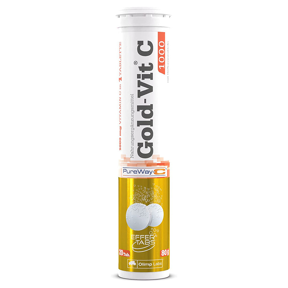 Olimp Labs Gold Vitamin C, 20 Effervescent Tablets, is a dietary supplement featuring a high dose of PureWayC, a patented form of vitamin C. PureWayC is a microencapsulated complex of Lascorbic acid and natural plant waxes, making it gentle on the stomach. This product includes sweeteners.