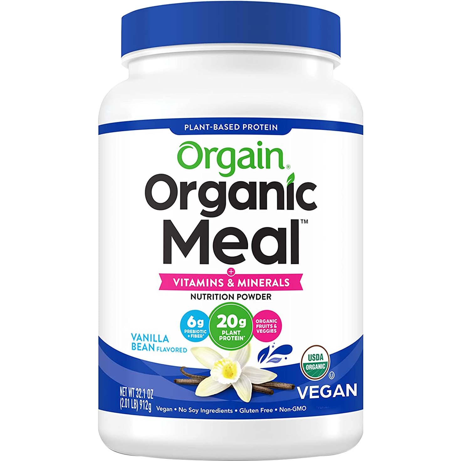 Orgain Organic Meal, Vanilla, 912 Gm is a plantbased meal replacement powder designed to provide a nutritious and convenient meal option. This product is certified organic and vegan, ensuring it meets high standards for quality and sustainability. Each serving delivers 20 grams of plantbased protein, making it a substantial source of protein for those following a plantbased diet.