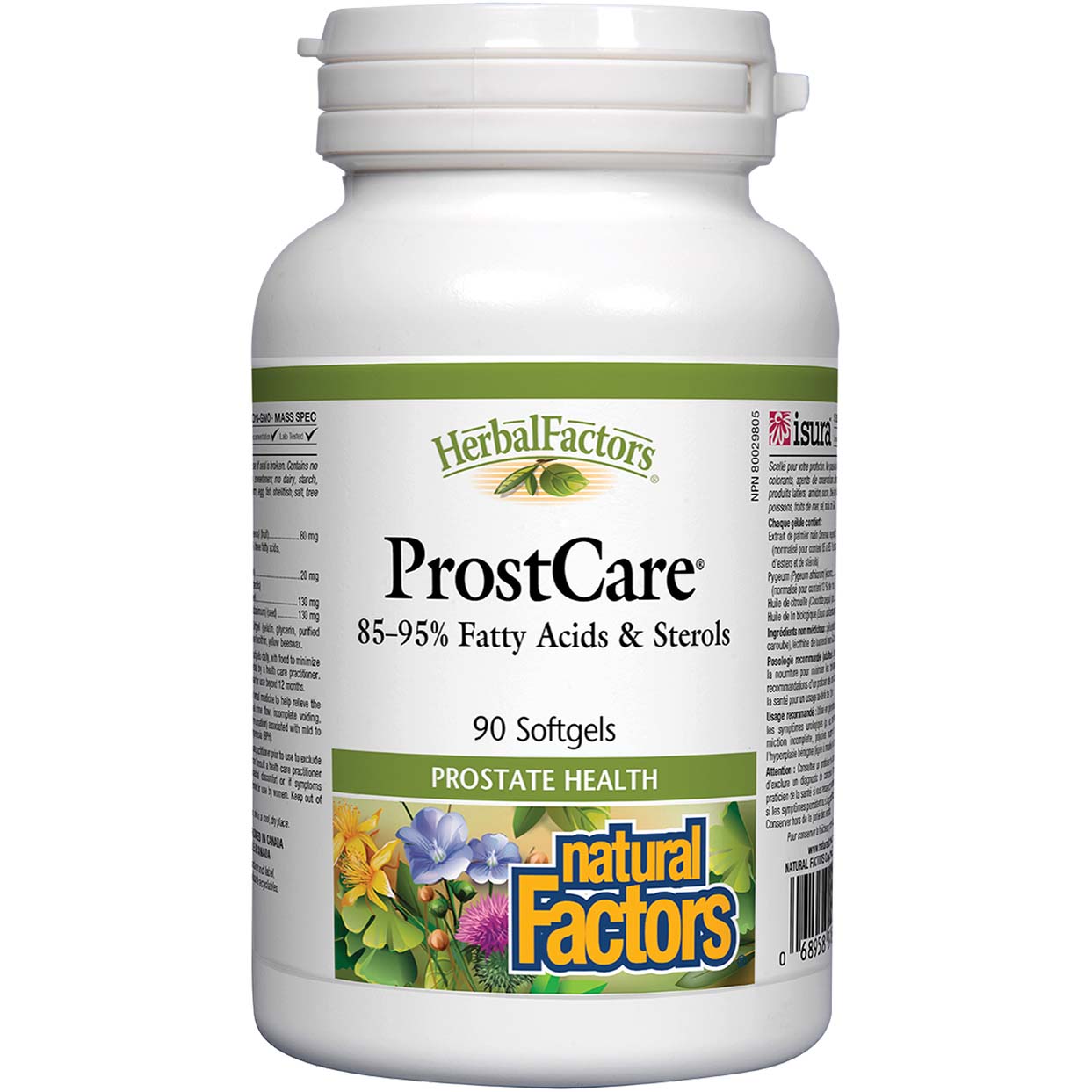 Natural Factors Prost Care, 90 Softgels, is a dietary supplement designed to support male urinary and prostate health. This product combines a standardized saw palmetto berry extract with pygeum, pumpkin seed oil, and flaxseed oil. Saw palmetto and pygeum are wellknown botanical treatments for benign prostatic hyperplasia (BPH), a common condition affecting men over 40. Flaxseed oil provides omega3 fatty acids, which are essential for overall health. Pumpkin seed oil is rich in zinc and helps reduce the size and symptoms of an enlarged prostate by inhibiting the enzyme that converts testosterone.