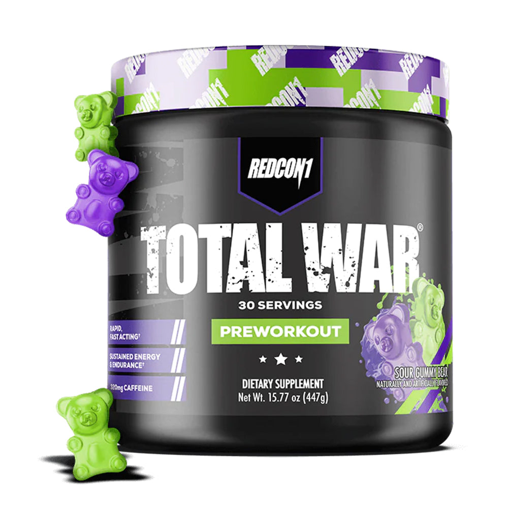 Redcon1 Total War Sour Gummy comes in a 30serving container, providing a month's supply for those who work out regularly. This preworkout supplement is formulated to help you dominate even your most challenging workouts by providing the necessary energy, focus, and endurance.
