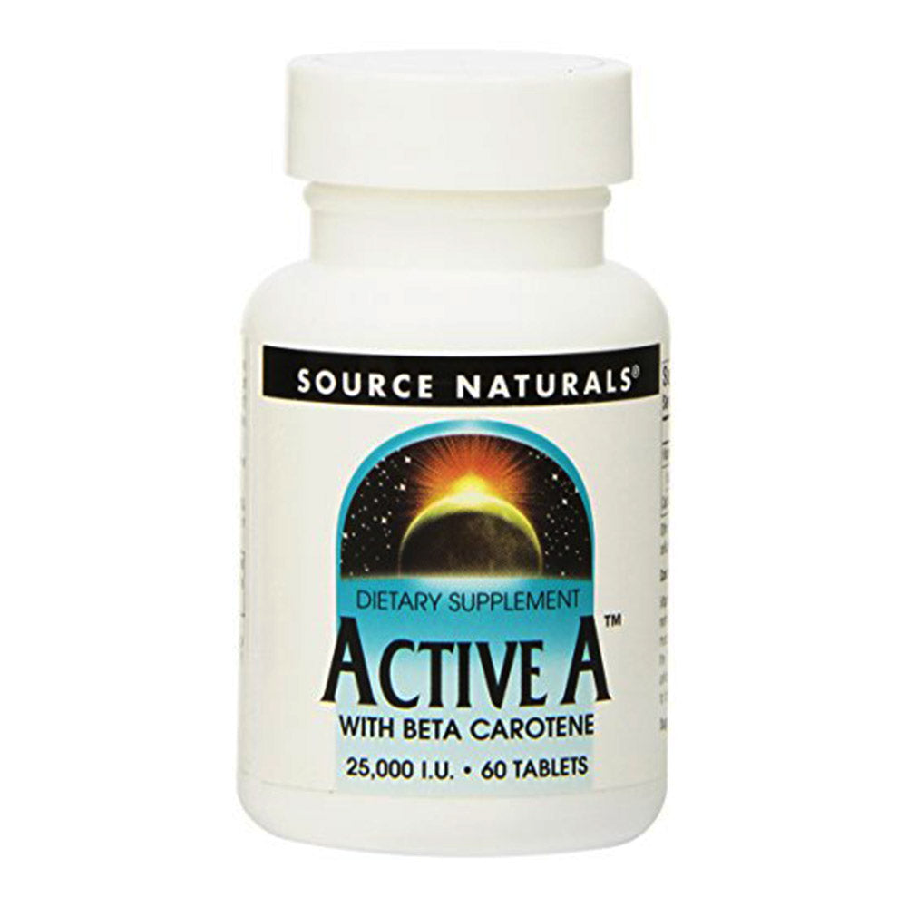 Source Naturals Active A provides 25,000 IU of Vitamin A per tablet, with a total of 60 tablets per bottle. Vitamin A is an essential nutrient necessary for normal and night vision, as well as for maintaining healthy skin and mucous membranes. This product supports the thymus gland and bone health.