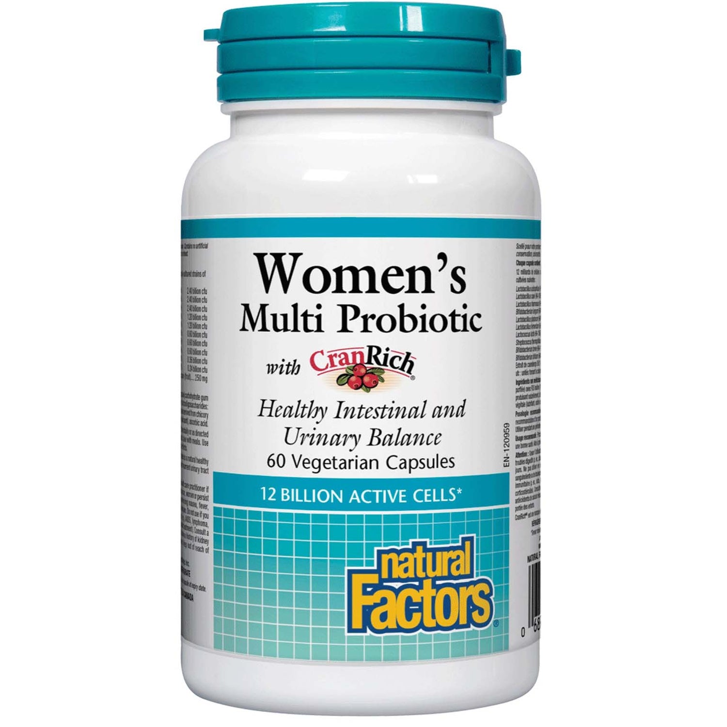 Natural Factors Women's Multi Probiotic is a dietary supplement designed to support women's health. Each serving contains 12 billion live probiotic cultures from 10 different strains, specifically chosen to benefit the intestinal, vaginal, and urinary tract health. The formula includes 300 mg of CranRich cranberry 36:1 concentrate, known for its role in preventing recurrent urinary tract infections (UTIs) and maintaining healthy digestive function.