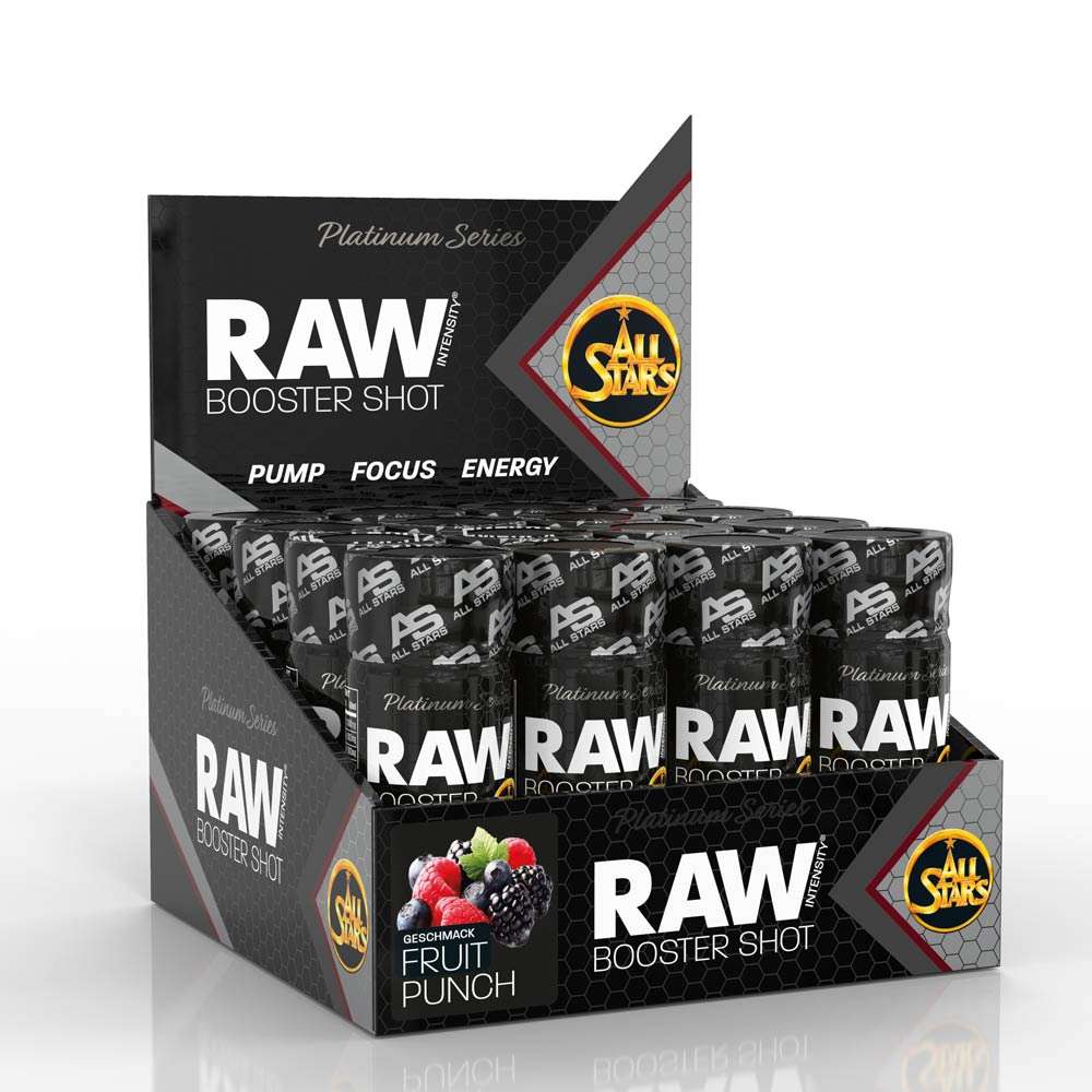 All Stars Raw Booster Shots, Fruit Punch, Box of 12 Shots, provide an intense energy boost before workouts for maximum intensity. Each 60ml shot is ready to drink and features the RAW Power Matrix, designed to enhance pump, energy, and focus during training. The liquid form ensures rapid absorption of ingredients.