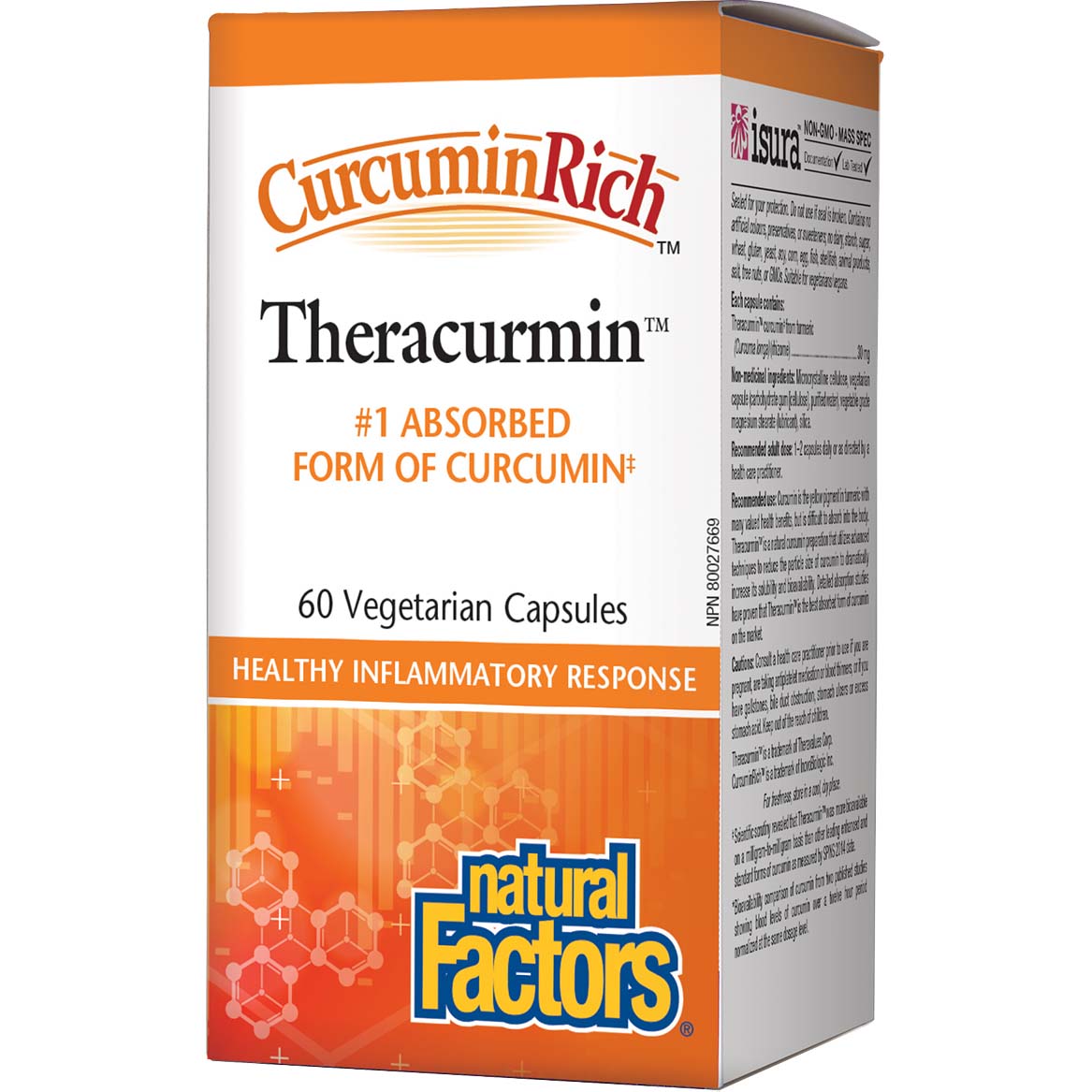 Natural Factors CurcuminRich Theracurmin provides 30 mg of curcumin per capsule, derived from the turmeric plant. Curcumin is known for its antioxidant and antiinflammatory properties. This supplement is designed to support overall health and wellbeing.