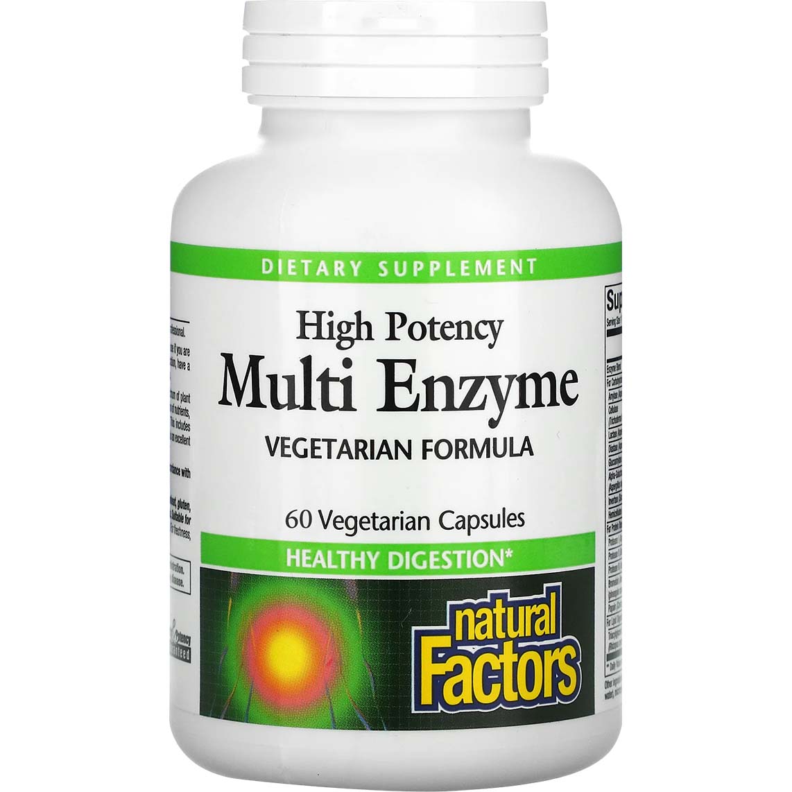 Natural Factors Multi Enzyme High Potency, 60 Capsules, is a dietary supplement designed to support digestive health. This product contains a blend of plantbased enzymes, including alphaamylase, lactase, bromelain, sucrose, and proteases. These enzymes aid in the breakdown and metabolism of proteins, fats, and carbohydrates, enhancing overall digestive functions.