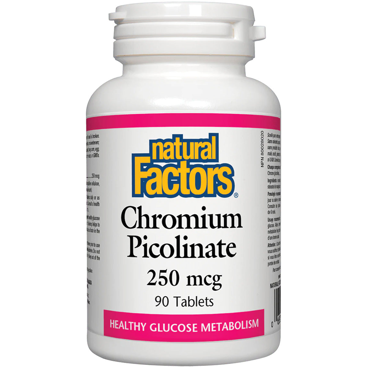 Natural Factors Chromium Picolinate, 250 mcg, 90 Tablets, is a dietary supplement designed to support healthy blood sugar levels and enhance insulin function. This product aids in the metabolism of glucose, carbohydrates, and fats, making it beneficial for individuals looking to maintain balanced blood sugar levels. Chromium picolinate is a highly absorbable form of chromium, which is essential for those at risk of chromium deficiency, a common issue among North Americans.