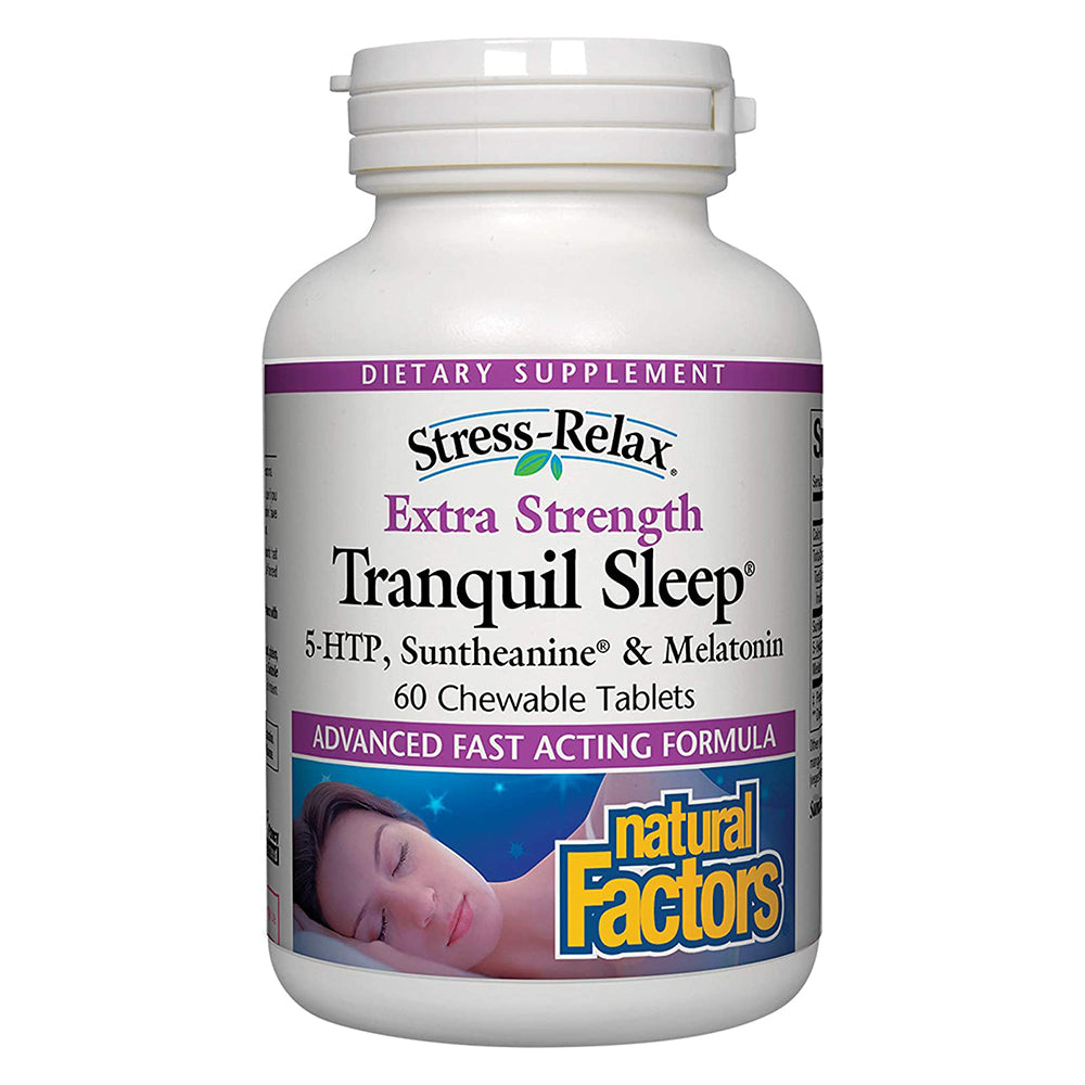 Natural Factors Tranquil Sleep Extra Strength is a dietary supplement designed to promote restful sleep and improve sleep quality. Each bottle contains 60 chewable tablets with a tropical fruit flavor. The formula includes a combination of Suntheanine Ltheanine, 5HTP, and melatonin. These ingredients work together to help you fall asleep quickly, maintain sound sleep, and wake up feeling refreshed.