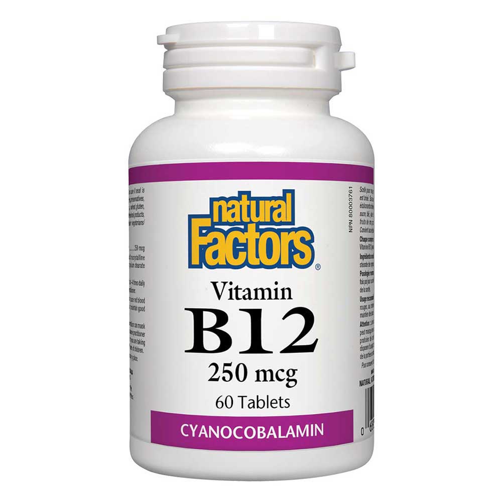 Natural Factors Vitamin B12, 250 mcg, 60 Tablets, provides essential support for various bodily functions. Vitamin B12, in the form of cyanocobalamin, is crucial for normal DNA synthesis and the production of red blood cells. It plays a significant role in preventing nerve damage and promoting cell growth and development.