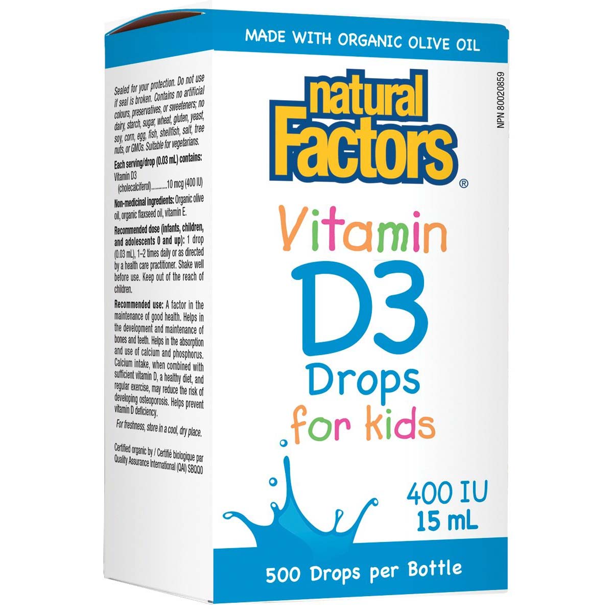 Please follow the instructions on the label of Vitamin D3 Drops for Kids, 400 IU, 15 ML - Natural Factorsor as directed by your healthcare provider.