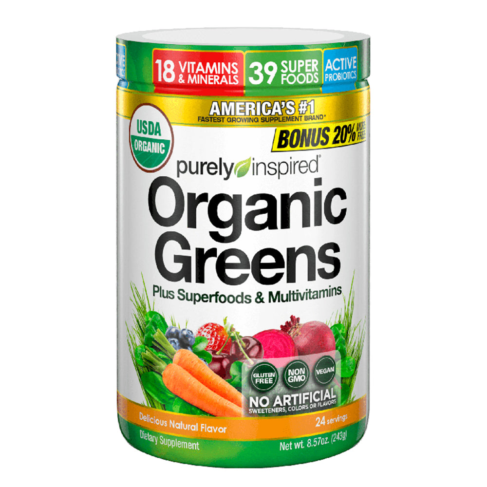 Purely Inspired Organic Greens, Unflavored, 24 is a dietary supplement designed to provide essential micronutrients efficiently. Each serving includes 39 superfoods, probiotics, 18 vitamins, and minerals, along with antioxidants C and E. The product is certified USDA Organic, glutenfree, nonGMO, and veganfriendly. It contains no artificial sweeteners, colors, or flavors.