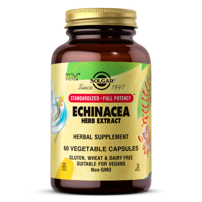 Solgar SFP Echinacea Herb Extract offers a natural way to support your immune system. Each bottle contains 60 vegetable capsules, formulated with highquality Echinacea, a plant native to regions east of the Rocky Mountains in the United States. Echinacea is related to sunflowers and ragweed, and its leaf, flower, and root are traditionally used in herbal medicine.