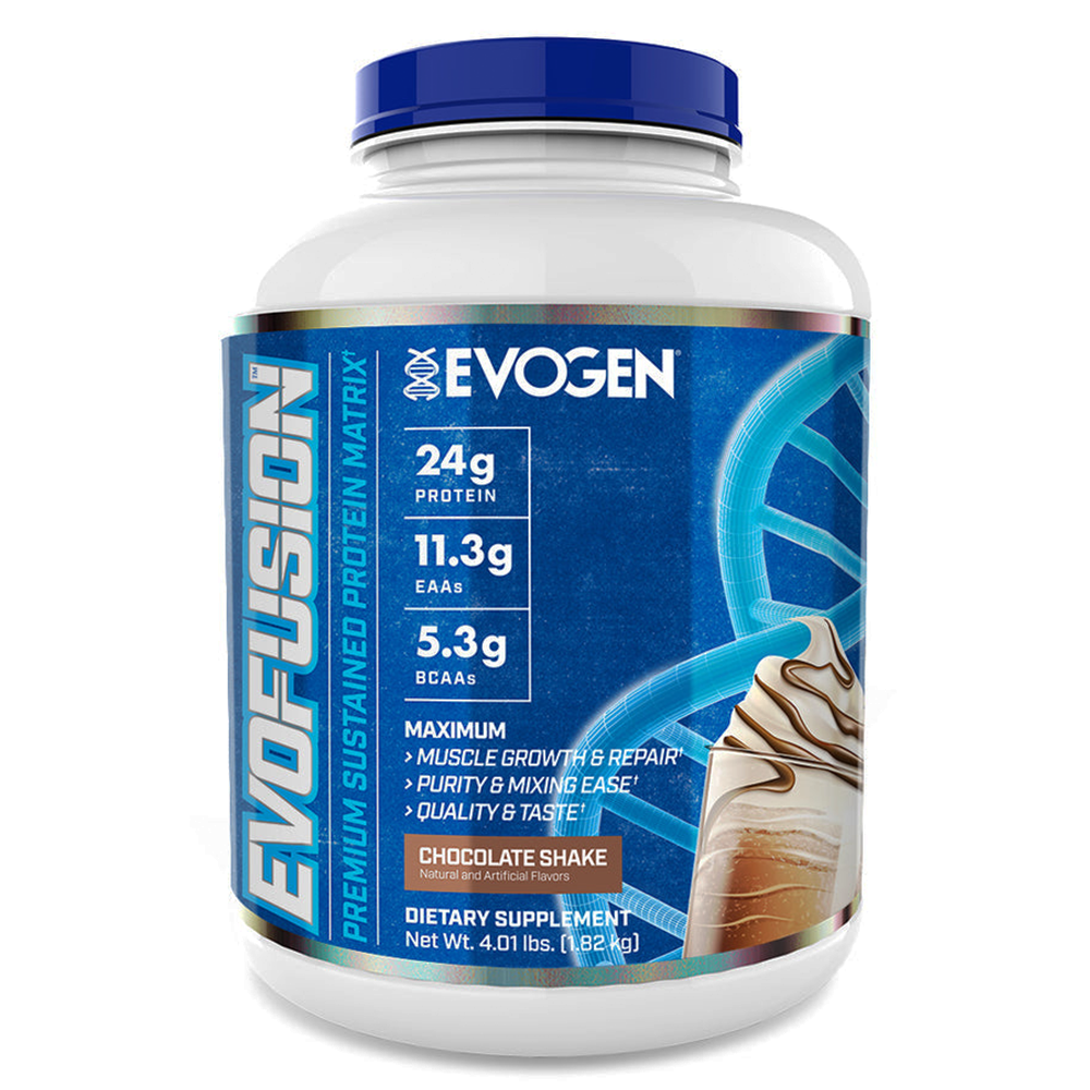Evogen Nutrition Evofusion, Chocolate, 4 LB, is a protein supplement designed to provide a balanced blend of fast, medium, and slowdigesting proteins. This product contains three protein sources in equal ratios to ensure steady amino acid absorption over an extended period. Each serving includes 9.3g of whey isolate for ultrafastacting protein, 10.64g of whey concentrate for mediumfastacting protein, and 9.58g of micellar casein for slowacting protein. This combination makes Evofusion suitable for use at any time of the day, including as a meal replacement.