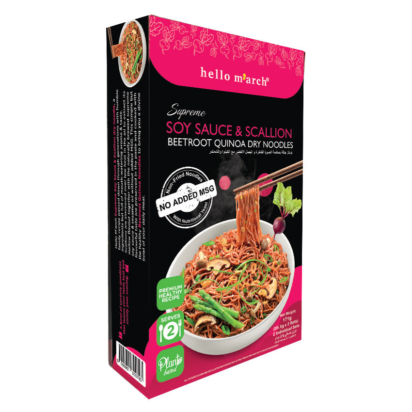 Hello March Soy Sauce & Scallion Beetroot Quinoa Dry Noodles, 171 G, offer a convenient and nutritious meal option. Each box contains two servings of nonfried noodles made from highprotein wheat flour and organic tricolor quinoa. These noodles are free from added MSG, artificial coloring, and flavoring. They also contain no preservatives or transfat, making them a healthier choice.