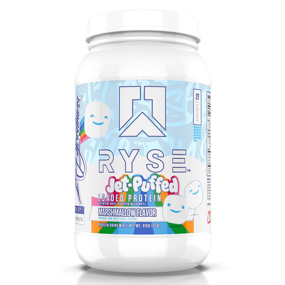RYSE Loaded Whey Protein in Jet Puffed Marshmallow flavor offers a highquality protein supplement designed to support your fitness goals. Each serving provides 25 grams of whey protein, primarily sourced from whey isolate, ensuring efficient protein absorption and muscle recovery. The formula includes added prebiotic fiber, which aids in digestive health, and MCTs (Medium Chain Triglycerides) to help boost metabolism.