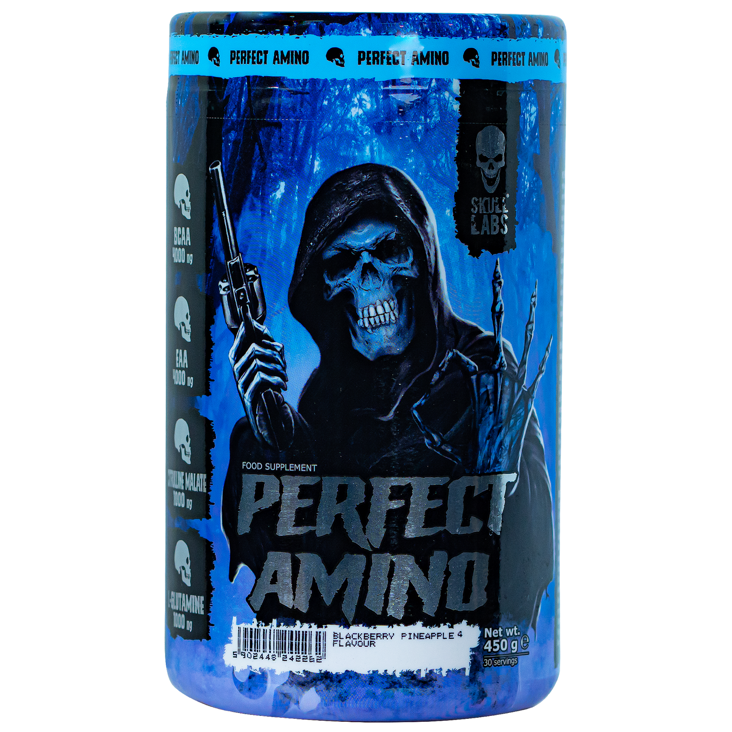 Skull Labs Perfect Amino, Blackberry Pineapple, 450 GM, is a comprehensive amino acid supplement designed to enhance your workout performance. This product includes essential amino acids (EAA), branchedchain amino acids (BCAA), Lglutamine, citrulline, and magnesium. Each component is carefully dosed to ensure optimal supply to your body.