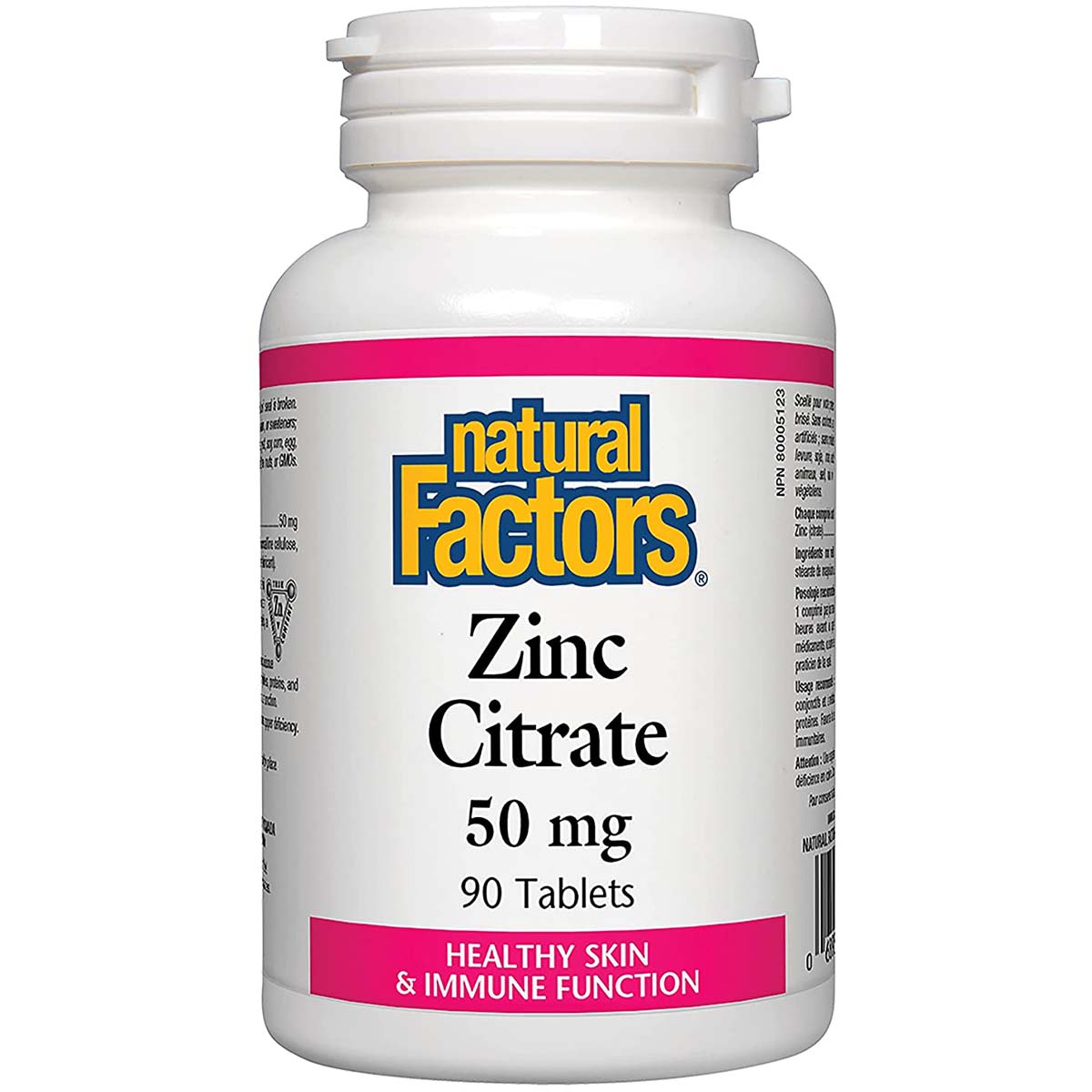 Natural Factors Zinc Citrate provides 50 mg of zinc per tablet, essential for supporting immune function and overall health. Zinc is a crucial trace mineral that aids in the body's ability to metabolize nutrients. It plays a significant role in the formation of connective tissue and helps maintain healthy skin, hair, nails, and bones. This product supports energy metabolism, contributing to the body's daily energy needs.